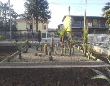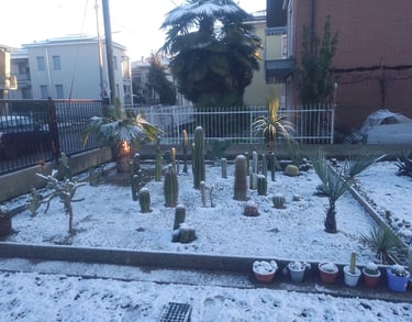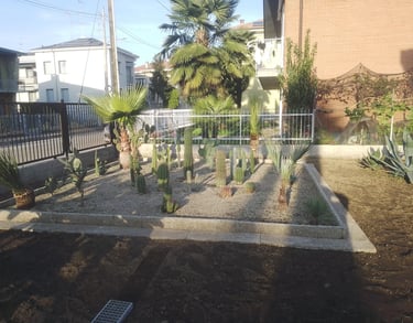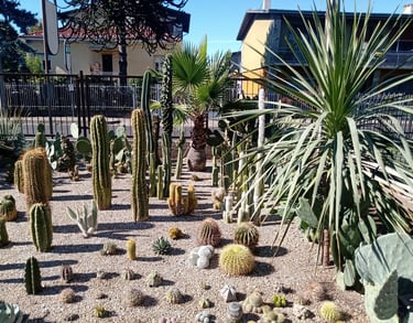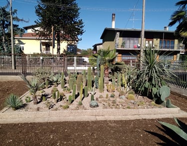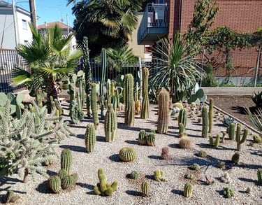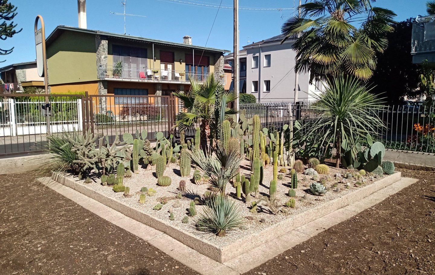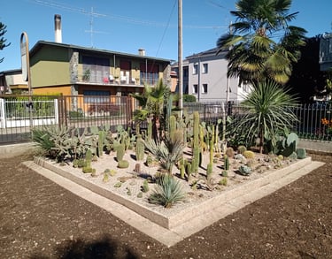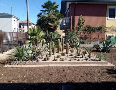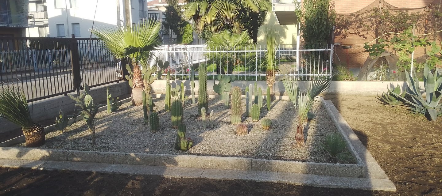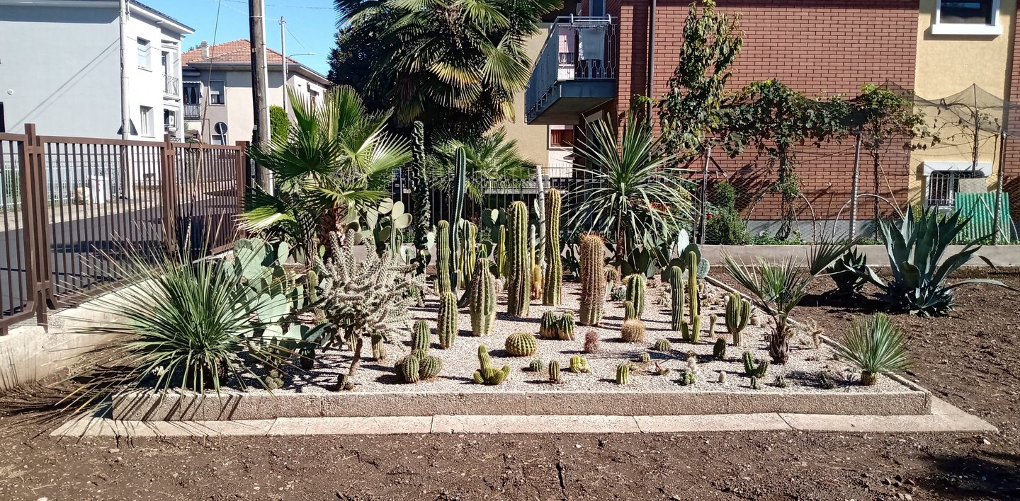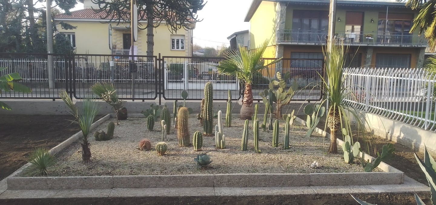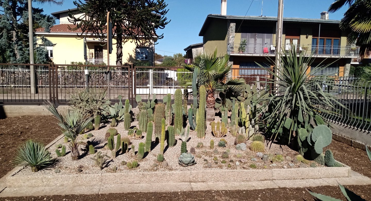 Esempio di aiuola all'aperto e non riparata composta da cactus e non solo, con piante selezionate per resistere agli inverni rigidi della nostra zona